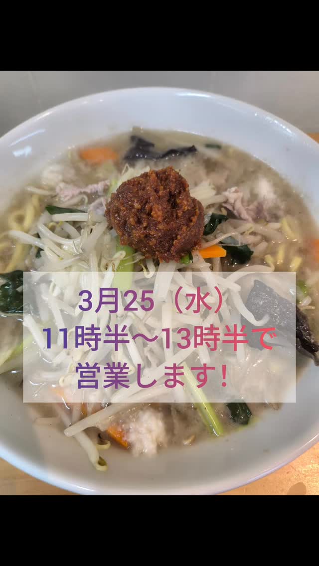 おはようございます! あっという間に3月に入りましたね! 明日火曜日は諸用の為14時までの営業とさせて頂きます。 明後日水曜日は11時〜13時で営業します。 大人気の「野菜たっぷり塩タンメン」も水曜日営業日は提供しますので、是非この機会にお越しください! #潟食 #タンメン#ラーメン #府中ラーメン #府中グルメ
